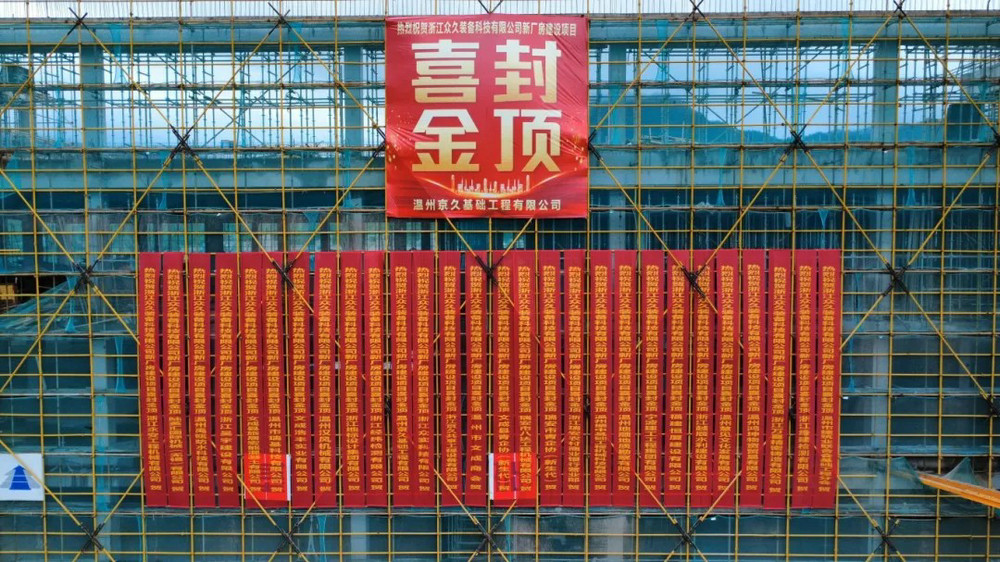 紅幅悅動,金字璀璨。7月21日,浙江眾久裝備科技有限公司新廠房建設項目結頂儀式圓滿舉行。公司高管及相關部門負責人,建設單位、監理單位的代表及嘉賓共同出席儀式,共聚項目現場,祝賀結頂之喜,見證榮耀時刻。